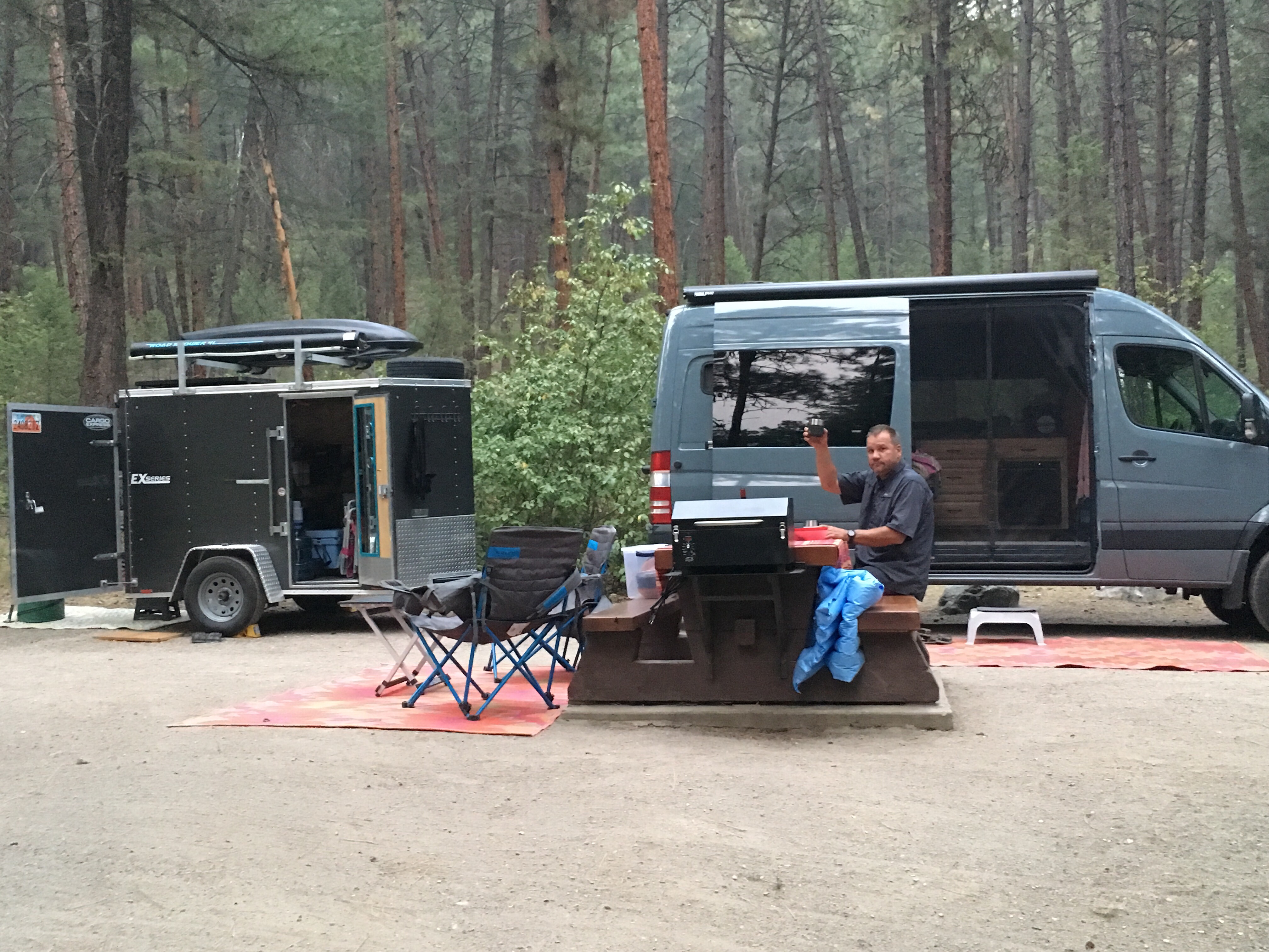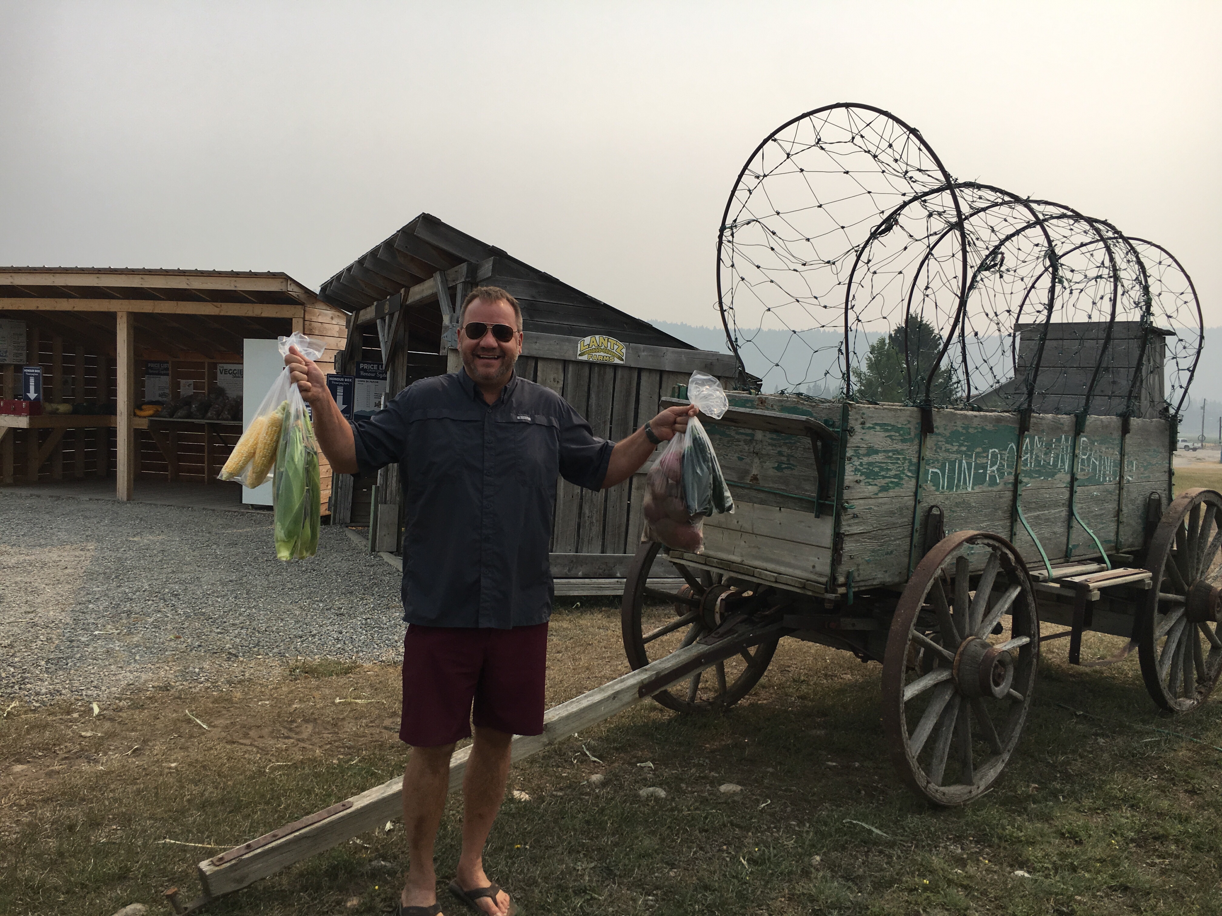 We crossed the border into Canada on Friday night, signaling our first day spent in somewhere other than Idaho 😀. The “Man” at the border hut forced us to dump all of our premium American firewood, but we made it into the country otherwise unscathed. We spent our first night in-country at a BC Provincial Park. We gorged ourselves on fresh produce we bought from the Lantz Family roadside stand (“honour system”), along with imported red Toscano wine and homemade Venetian risotto. We cashed in our strong American dollars for Canadian Monopoly money as we received our very first derogatory Trump comment from the Australian guy working for the Canadian Provincial Park Service. We thanked him for his perspective, and then we went to sleep.